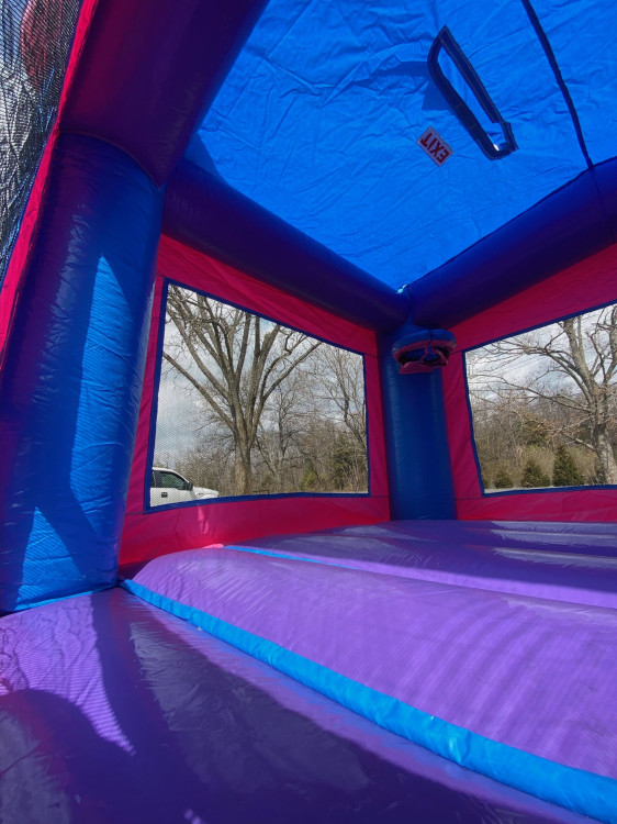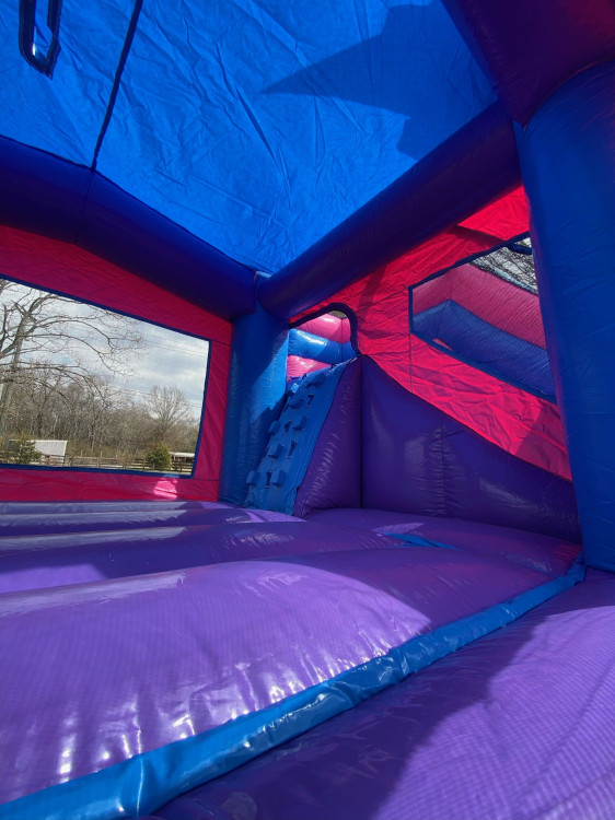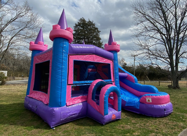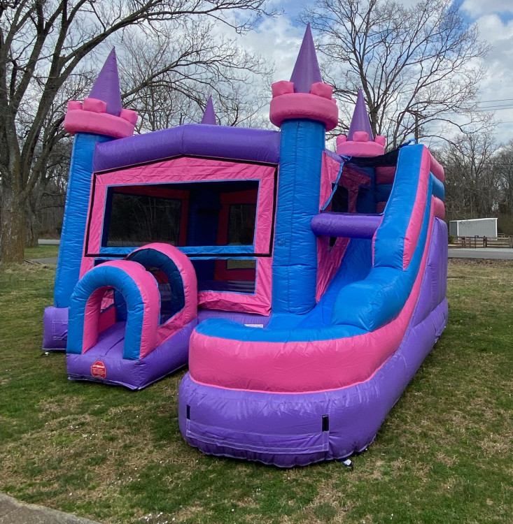 The Sugar Rush bounce house with slide is a vibrant combo inflatable featuring a spacious jumping area and a 10-foot slide, available for rent in Murfreesboro and throughout Middle Tennessee. Designed in eye-catching shades of pink, purple, and sky blue, this unit delivers the perfect blend of bouncing excitement and sliding thrills for events across Rutherford County and neighboring communities.