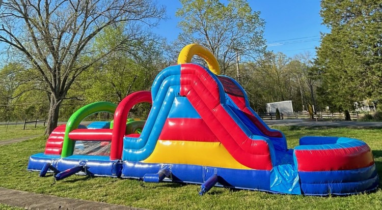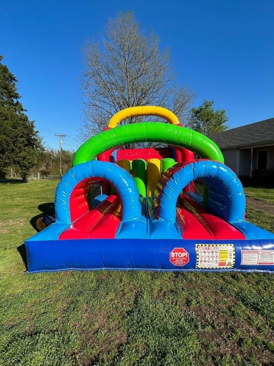 The Berserker is a 40-foot multi-colored obstacle course inflatable that delivers non-stop action and competitive excitement for guests of all ages at events throughout Murfreesboro and the surrounding Middle Tennessee area. This dynamic rental combines climbing, crawling, twisting turns, and a double-lane slide finale that can be used dry or with water, making it a versatile centerpiece for parties and gatherings across Rutherford County and beyond.